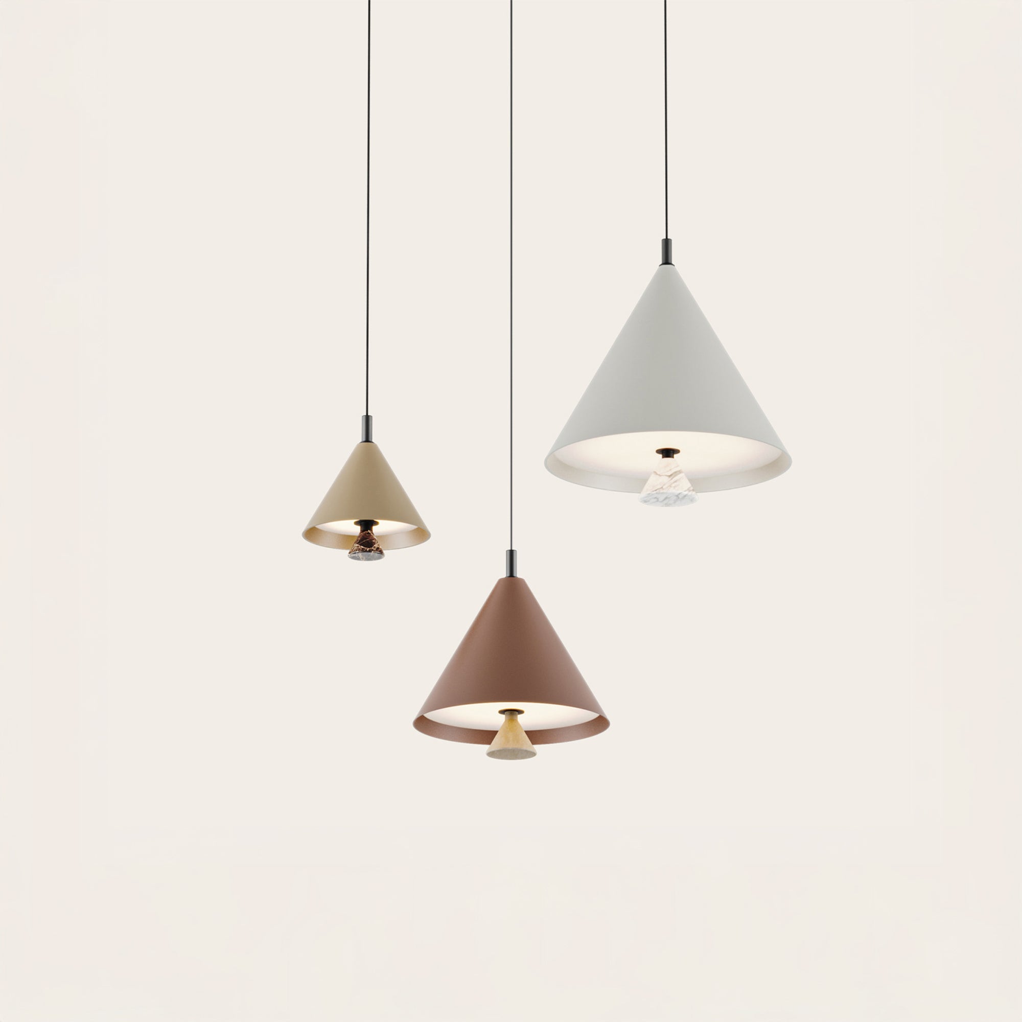 Nastavna lampa Marg španjolskog brenda Aromas del Campo, dizajna Pepe Fornasa, ističe se svojom minimalističkom elegancijom i savršenom ravnotežom između metala i kamena. Tijelo lampe sastoji se od metalnog stošca, dostupnog u mat teksturiranoj crnoj ili bijeloj boji, ili u drugim nijansama iz palete boja prikazane u galeriji slika. Jedinstveni detalj je dekorativni element na dnu lampe, koji se može odabrati od prirodnog travertina ili mramora u crnoj, bijeloj, smeđoj ili zelenoj boji. Marg je opremljena integriranim LED izvorom svjetlosti i TRIAC tehnologijom prigušivanja, koja omogućuje glatko podešavanje intenziteta svjetlosti. Rasvjetno tijelo dostupno je u tri veličine – 200 mm, 300 mm i 400 mm, što omogućuje fleksibilnu upotrebu pojedinačno ili u kombinacijama za stvaranje skladne rasvjetne kompozicije u svakom interijeru.