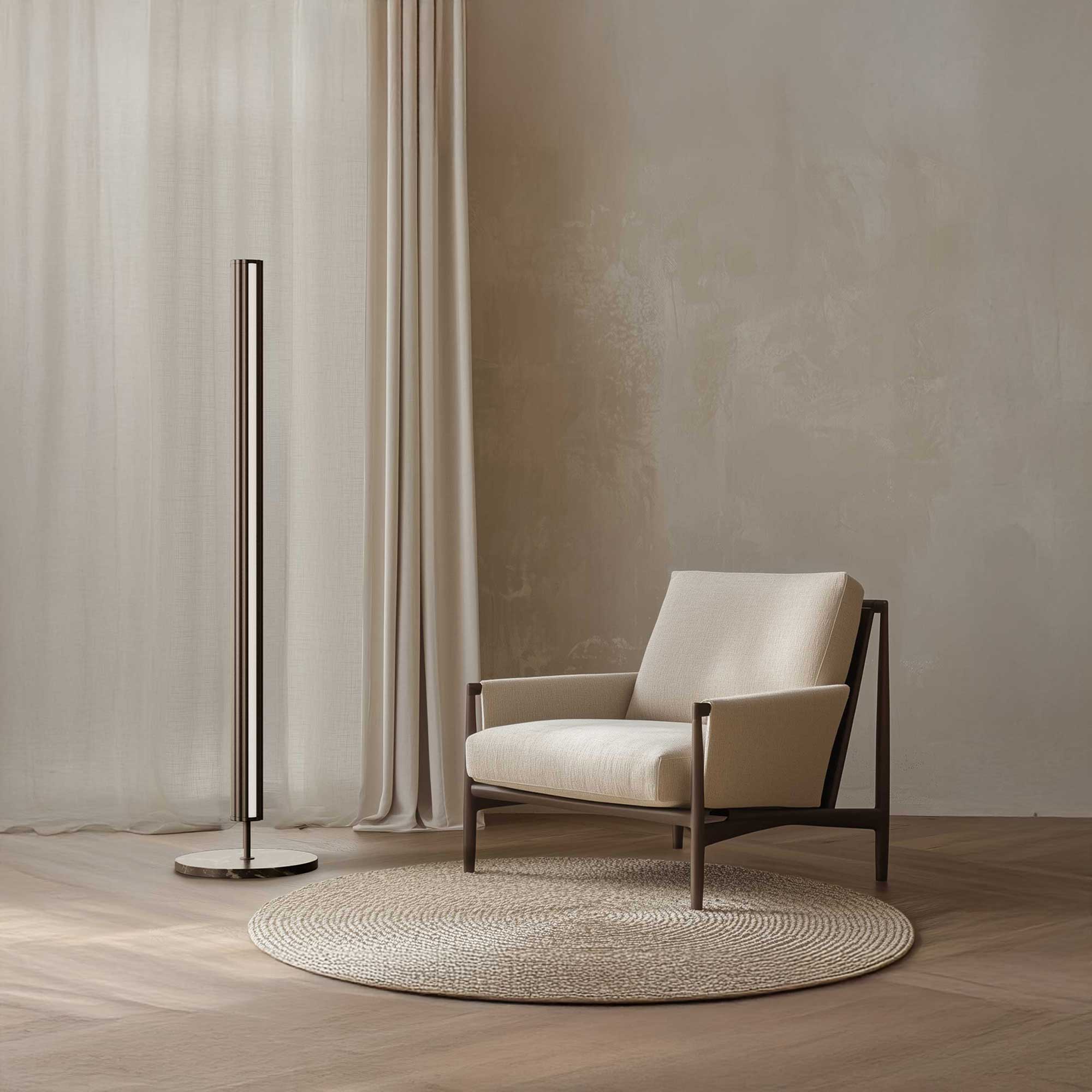Podna lampa Niro španjolskog brenda Aromas del Campo upečatljiv je primjer profinjenog dizajna koji u skladnu cjelinu spaja metal, drvo i kamen. Tijelo lampe sastoji se od elegantne metalne cijevi dostupne u zlatnoj ili crnoj boji, s oba kraja obloženih orahovim drvetom. Cijela konstrukcija stoji na čvrstoj mramornoj podlozi, dostupnoj u bijeloj ili crnoj boji. Integrirani LED izvor svjetlosti od 30 W s luminancijom od 1850 lm pruža ugodno i ravnomjerno svjetlo koje se može neprekidno prigušivati pomoću prigušivača smještenog na kabelu. Niro stoga nudi ne samo vizualno privlačnu kombinaciju materijala, već i funkcionalnu fleksibilnost za različite unutarnje atmosfere.
