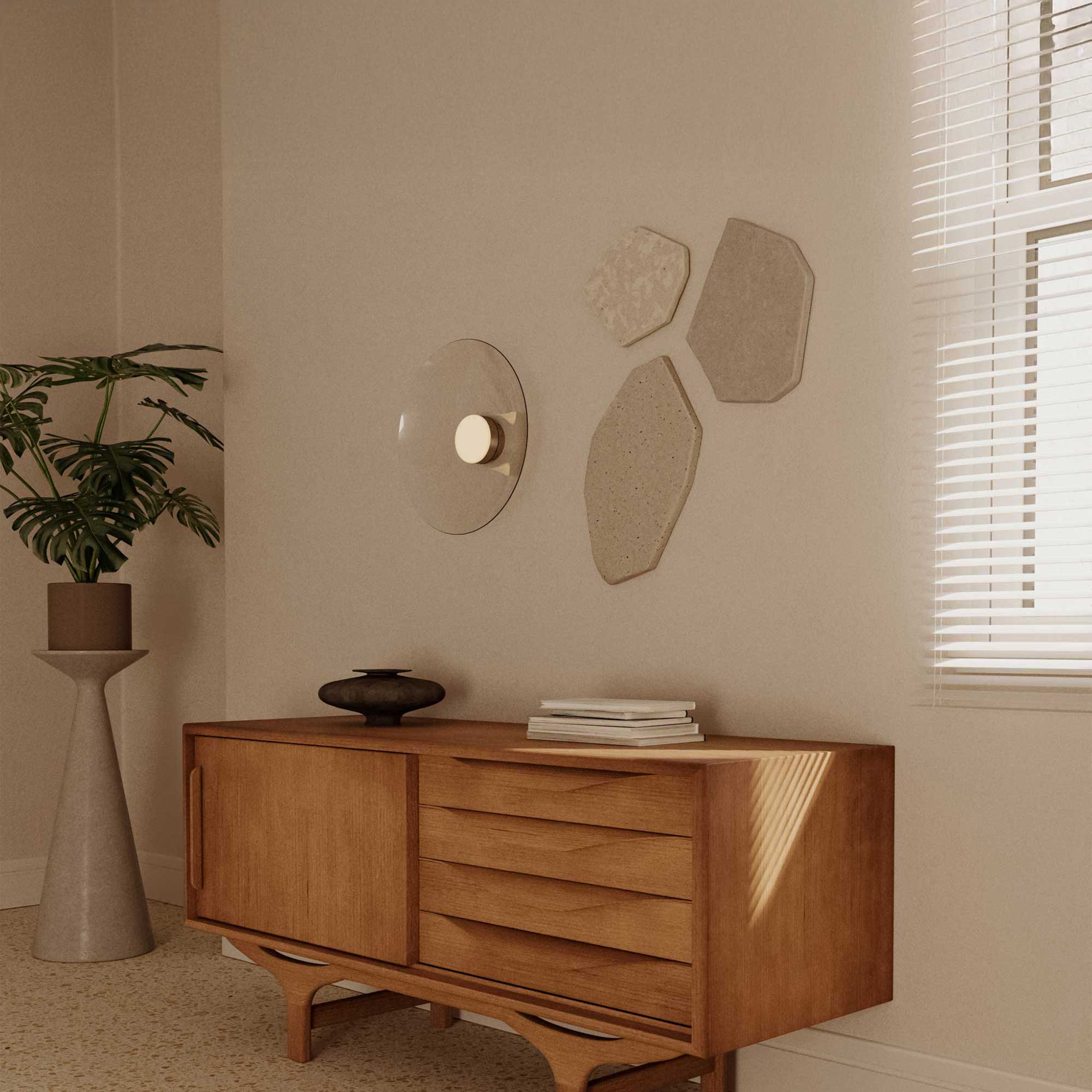 Zidna svjetiljka Vitree iz Aromas del Campo, dizajnirana od Pepe Fornasa, očarava svojim okruglim oblikom i kombinacijom metalne baze i elegantnog staklenog sjenila. Unutra se nalazi izvor svjetlosti s E27 grlom, a u paketu je uključena dimabilna žarulja od 5 W, 450 lm, 2700 K. Ova žarulja ima prednji prigušivač, stoga ne stvara izravan odbljesak, već nježno ambijentalno svjetlo koje se bočno širi kroz staklenu sjenu. Rezultat je ugodna i topla atmosfera koja pristaje modernim interijerima u dnevnim boravcima, spavaćim sobama ili reprezentativnim prostorima.