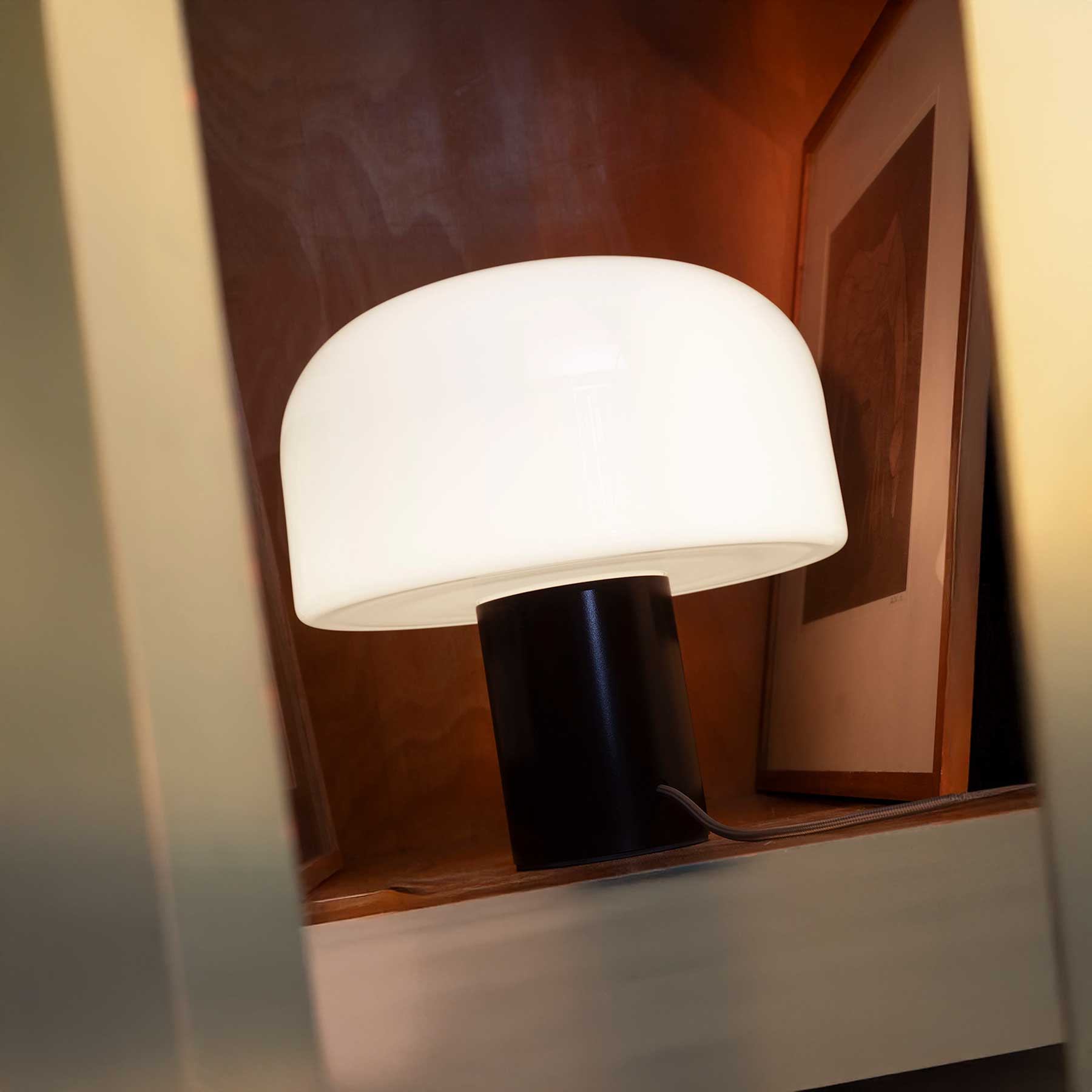 Bellhop Glass T talijanske tvrtke Flos velika je stolna lampa koja se ističe elegantnim dizajnom i visokokvalitetnom difuzijom svjetla. Njezin kupolasti difuzor izrađen je od tri sloja opalnog stakla, s bijelim slojem smještenim između dva sloja prozirnog stakla, koji se istovremeno pušu. Debljine pojedinih slojeva variraju, doprinoseći optičkoj dubini i kvaliteti svjetla. Ovaj sofisticirani dizajn stvoren je u suradnji s razvojnim odjelom tvrtke Flos i, zahvaljujući svojoj veličini, pruža ujednačeno, toplo i ugodno osvjetljenje koje stvara ugodnu atmosferu u prostoru. Vrsta Bellhop Glass T, promjera 33 cm, stoji na cilindričnoj aluminijskoj podlozi promjera 12 cm i dostupna je u svijetloj aluminijskoj, čokoladnoj i bijeloj boji. Materijali lampe nisu samo vizualno privlačni, već su i potpuno reciklabilni, što potvrđuje predanost tvrtke Flos održivosti.