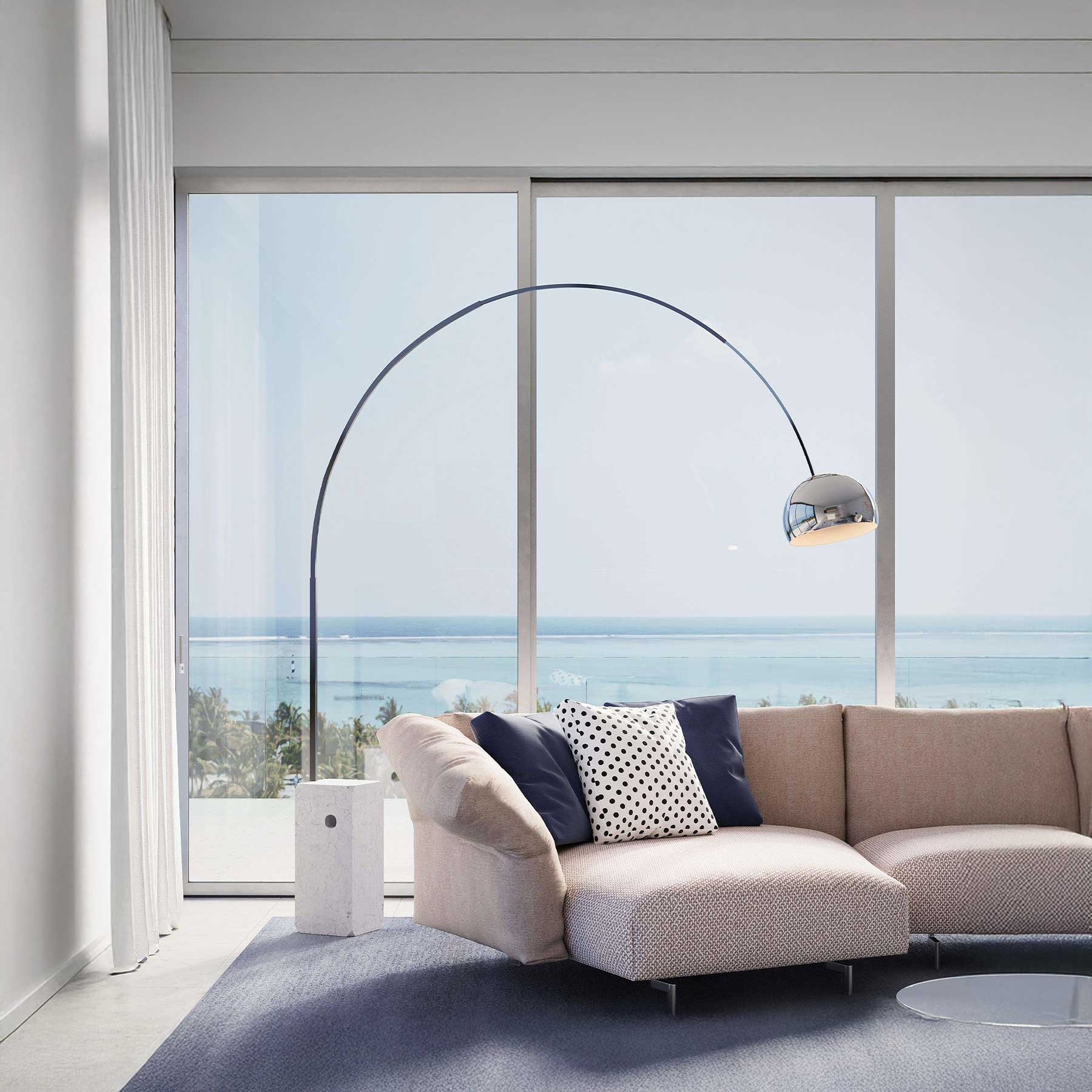 Lampa Arco tvrtke Flos ikonična je podna lampa koja pruža izravno svjetlo, a dizajnirali su je poznati talijanski dizajneri Achille i Pier Giacomo Castiglioni 1962. godine. Ima bazu od bijelog mramora Carrara, teleskopski stalak od nehrđajućeg čelika s mat završnom obradom i rotirajući reflektor podesive visine od poliranog aluminija s zaštitnim lakom. Zahvaljujući elegantnom zakrivljenom obliku, lampa se može postaviti u prostoriju bez potrebe za montažom na strop. Lampa koristi LED tehnologiju s temperaturom boje od 2700 K, svjetlosnim tokom od 1224 lm i potrošnjom energije od 28 W.