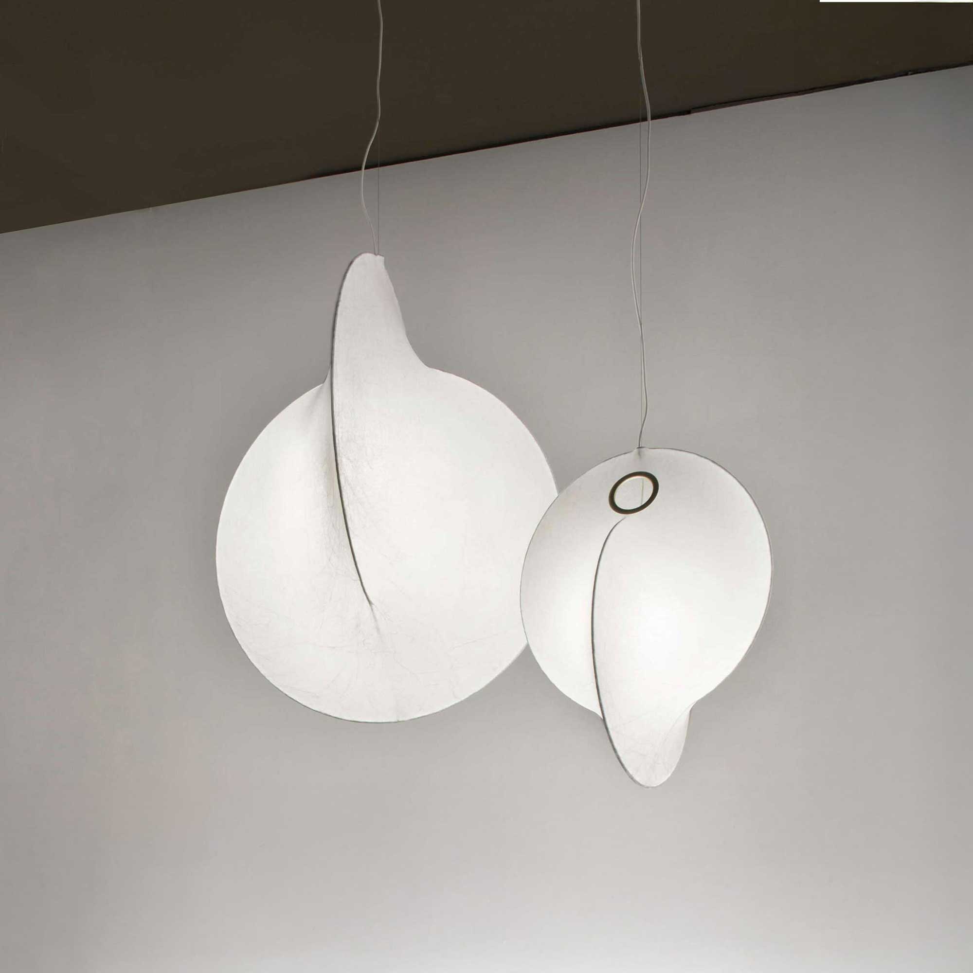 Ovjesna lampa Overlap talijanskog brenda Flos, dizajnirana od Michaela Anastassiadesea, jedinstven je primjer kombinacije inovativne tehnologije i suptilne estetike. Unutarnja struktura lampe izrađena je od čelika s bijelim praškastim premazom i prekrivena posebnim slojem smole Cocoon koji stvara meko, raspršeno svjetlo. Površina je potom zaštićena prozirnim sprej premazom. Još jedna upečatljiva značajka dizajna je metalni prsten s pozlaćenim završnim slojem, koji vizualno razbija volumen lampe. Stropna rozeta izrađena je od poliranog legura Zamak, također s pozlaćenim završnim slojem. Rasvjetno tijelo dostupno je u dvije veličine i nalikuje kukuljici, čija nježna struktura priziva atmosferu smirenosti i harmonije.