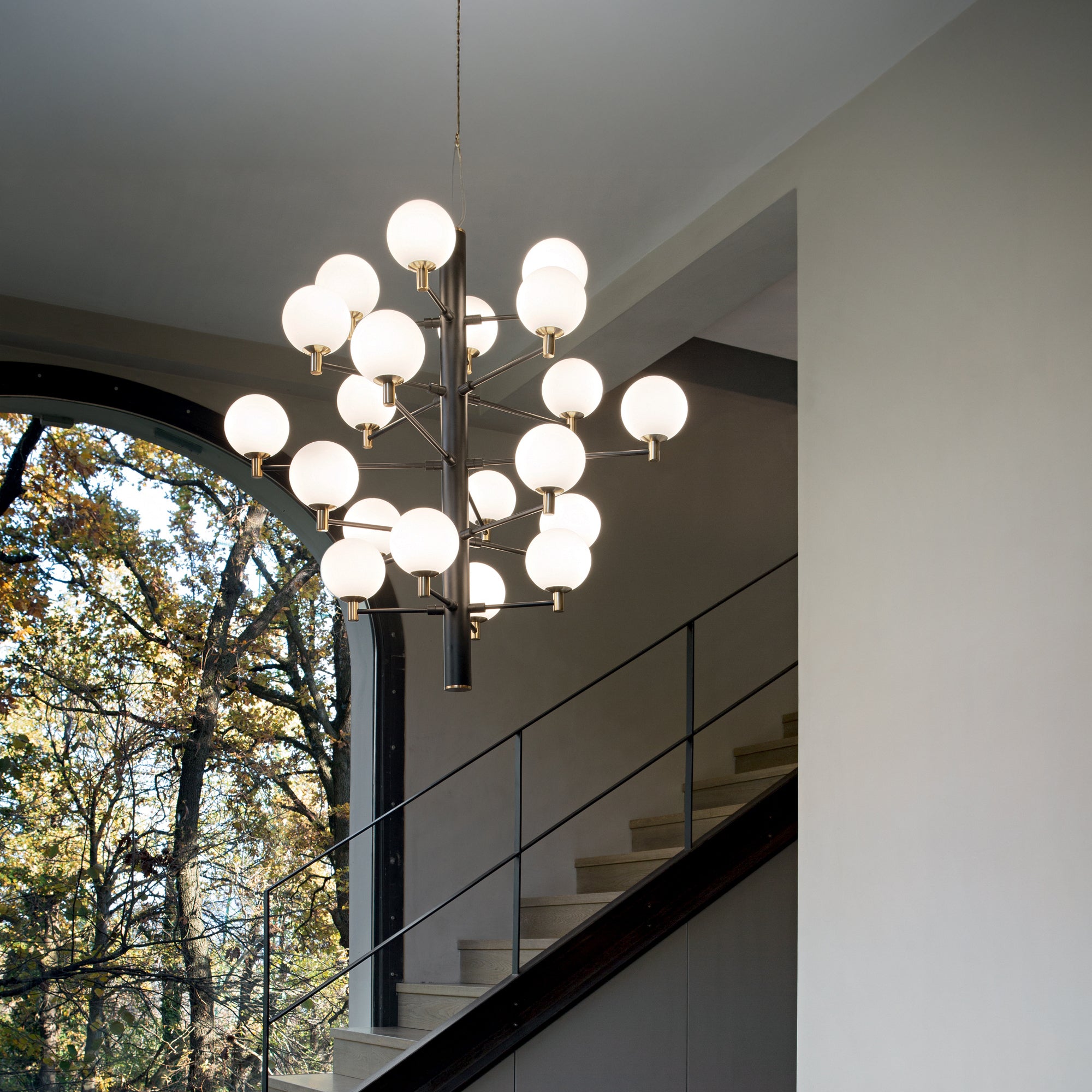 Ovisno rasvjetno tijelo Kopernik od talijanske tvrtke Ideal Lux kombinira moderna elegancija s bezvremenski dizajn. Svjetiljka ima mat crno metalno kućište, na kojem, koristeći tanke šipke s zlatnim vrhovima pričvršćen ručno puhanih staklenih difuzora s bijeli mat premaz i površina kiselinski gravirana za nježno raspršivanje svjetla. Svjetiljka je dostupna u verziji s 12 ili 20 difuzora, što vam omogućuje prilagodbu intenzitet i domet osvjetljenja ovisno o prostoru. kombinacija black metal strukture sa zlatnim detaljima i fin opalni staklo dodaje se unutrašnjosti luksuzan i profinjen izgled.