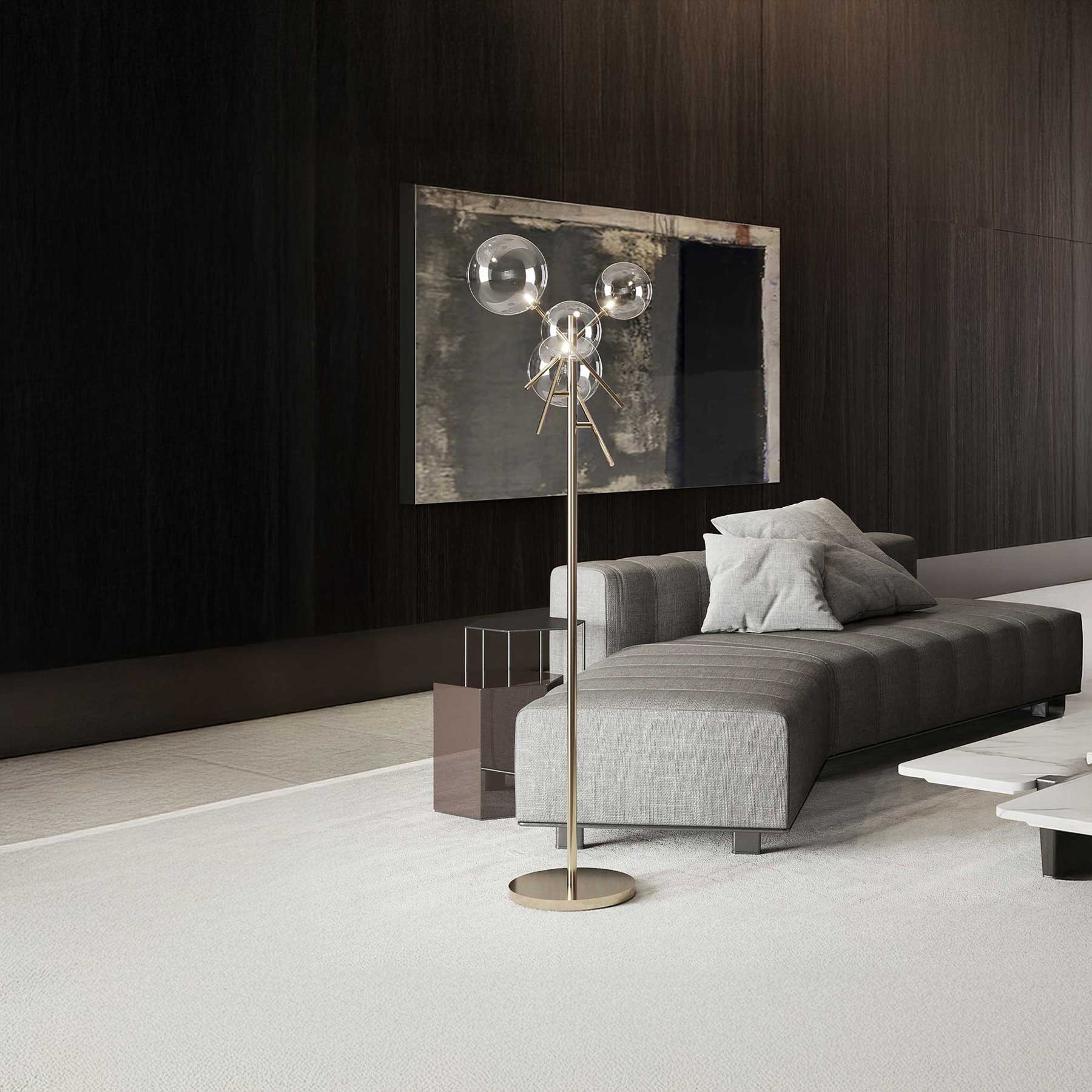 Podna svjetiljka Equinoxe talijanskog brenda Ideal Lux savršena je kombinacija luksuznog dizajna i funkcionalne fleksibilnosti. Metalna konstrukcija, dostupna u poliranom kromu ili antiknom mesingu, podržava četiri difuzora od borosilikatnog stakla u obliku sfera, koji mogu biti prozirni, dimljeno sivi ili jantarno zlatni. Zahvaljujući domišljato dizajniranim metalnim rukama, difuzori se mogu podesiti u različite položaje kako bi se stvorile dinamične svjetlosne kompozicije. Svjetiljka je opremljena G4 grlima i, svojim elegantnim, ali svestranim izgledom, pogodna je za moderne i klasične interijere, gdje djeluje kao upečatljiv dizajnerski element i izvor ugodnog osvjetljenja.
