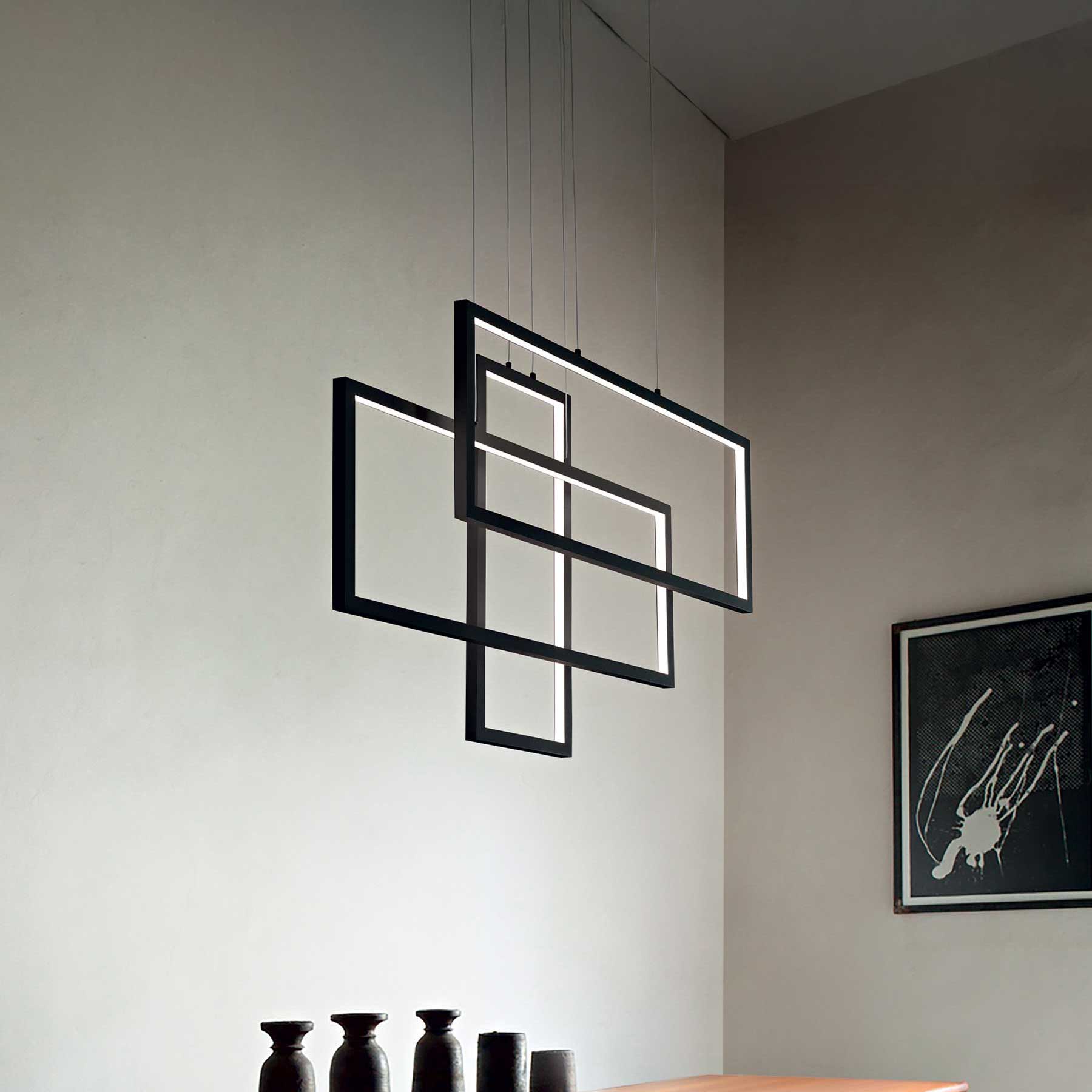 LED viseća svjetiljka Frame tvrtke Ideal Lux nudi moderan i minimalistički dizajn u četvrtastoj, kružnoj ili pravokutnoj izvedbi, s mat bijelim ili crnim metalnim okvirom, bazom i OPALE plastičnim difuzorima za meko, raspršeno svjetlo. Podesivi kabeli omogućuju jednostavno podešavanje visine, dok LED tehnologija osigurava učinkovito izravno osvjetljenje – idealno za dnevne boravke, kuhinje ili urede. Čiste linije i univerzalni izgled omogućuju i samostalnu upotrebu i zanimljive kompozicije pri kombiniranju više komada.