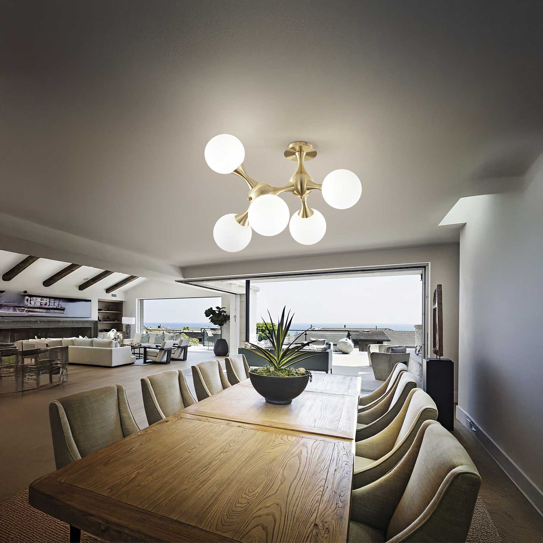 Stropna svjetiljka Nodi talijanskog brenda Ideal Lux elegantan je dizajnerski element prikladan za moderne interijere. Metalna konstrukcija u kromiranom ili satenirano mesinganu izdanju nosi pet sferičnih staklenih difuzora od bijelog, ručno puhanog stakla s kiselinskim graviranjem, dostupnih u prozirnoj ili kromiranoj izvedbi. Svjetiljka je opremljena E14 grlima, što omogućuje upotrebu različitih vrsta žarulja prema potrebi. Organski oblikovana struktura svjetiljke podsjeća na molekulu te je istovremeno funkcionalna i estetski privlačna. Nodi je idealan za dnevne boravke, blagovaonice ili predsoblja, gdje služi kao dekorativna i praktična rasvjetna naprava.