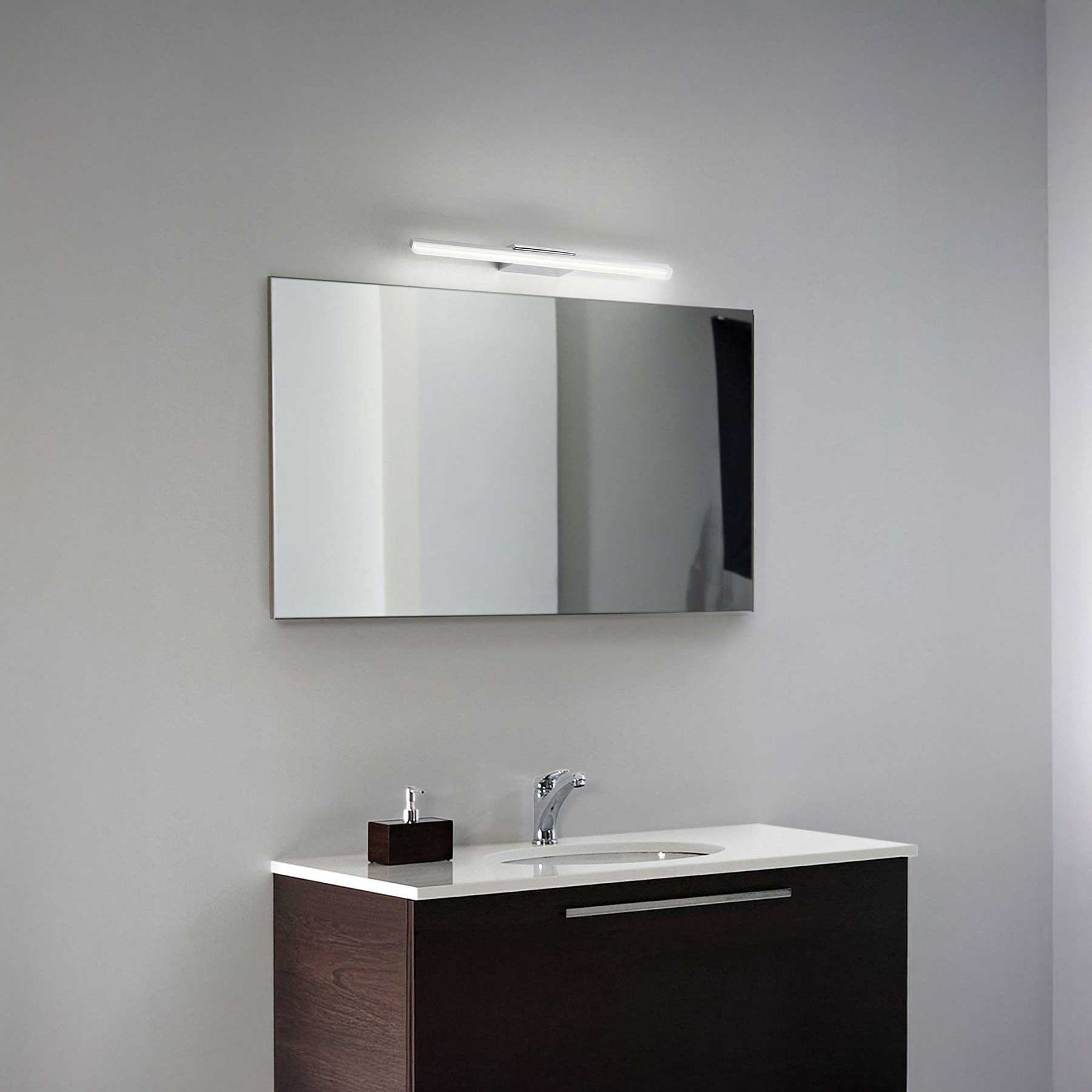 Moderni LED rasvjetni aparat Riflesso tvrtke Ideal Lux, sa svojim uzdužnim dizajnom i zaštitom IP54, idealno je rješenje za rasvjetu kupaonice iznad ogledala. Metalna konstrukcija dostupna je u sjajnoj kromiranom, mat bijelom ili crnom izvedbi, dok saten-mat akrilni difuzor osigurava ugodnu i ravnomjernu raspodjelu svjetla. Svjetiljka je otporna na vlagu i prašinu, dolazi u tri veličine i, zahvaljujući svom minimalističkom dizajnu, savršeno se uklapa u moderne interijere. Zahvaljujući visokom indeksu reprodukcije boja (CRI > 90) i preciznoj reprodukciji boja (SDCM ≤ 3), jamči istinsku i prirodnu reprodukciju boja, što je osobito važno pri nanošenju šminke ili brijanju.