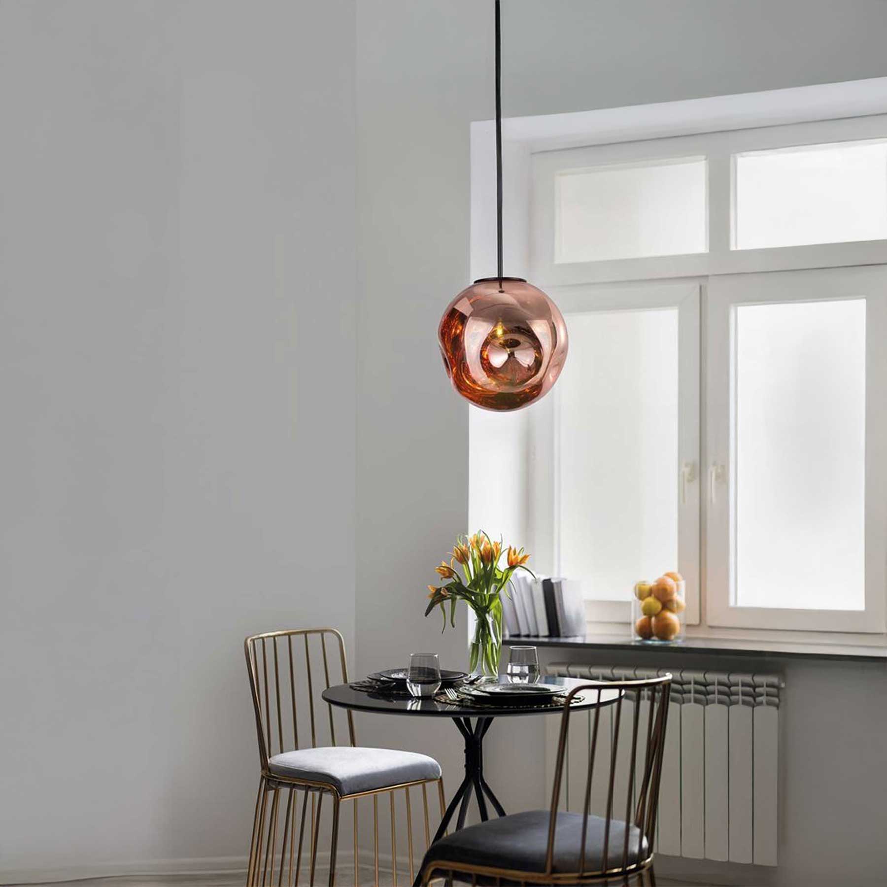 Mayan viseća svjetiljka renomirane grčke marke Nova Luce elegantna je kombinacija modernog dizajna i nježne umjetnosti stakla. Sjenilo je izrađeno od puhanog stakla, čiji organski sferični oblik s nepravilnim valovima stvara zanimljive optičke efekte. Svjetiljka koristi E27 grlo, što osigurava fleksibilnost pri odabiru izvora svjetlosti. Mayan je dostupna u tri elegantne boje: bakarnoj, šampanjac i dimnoj. Zahvaljujući svom prepoznatljivom izgledu, pogodna je kao samostalni element ili kao dio višesvjetiljke u modernim interijerima.