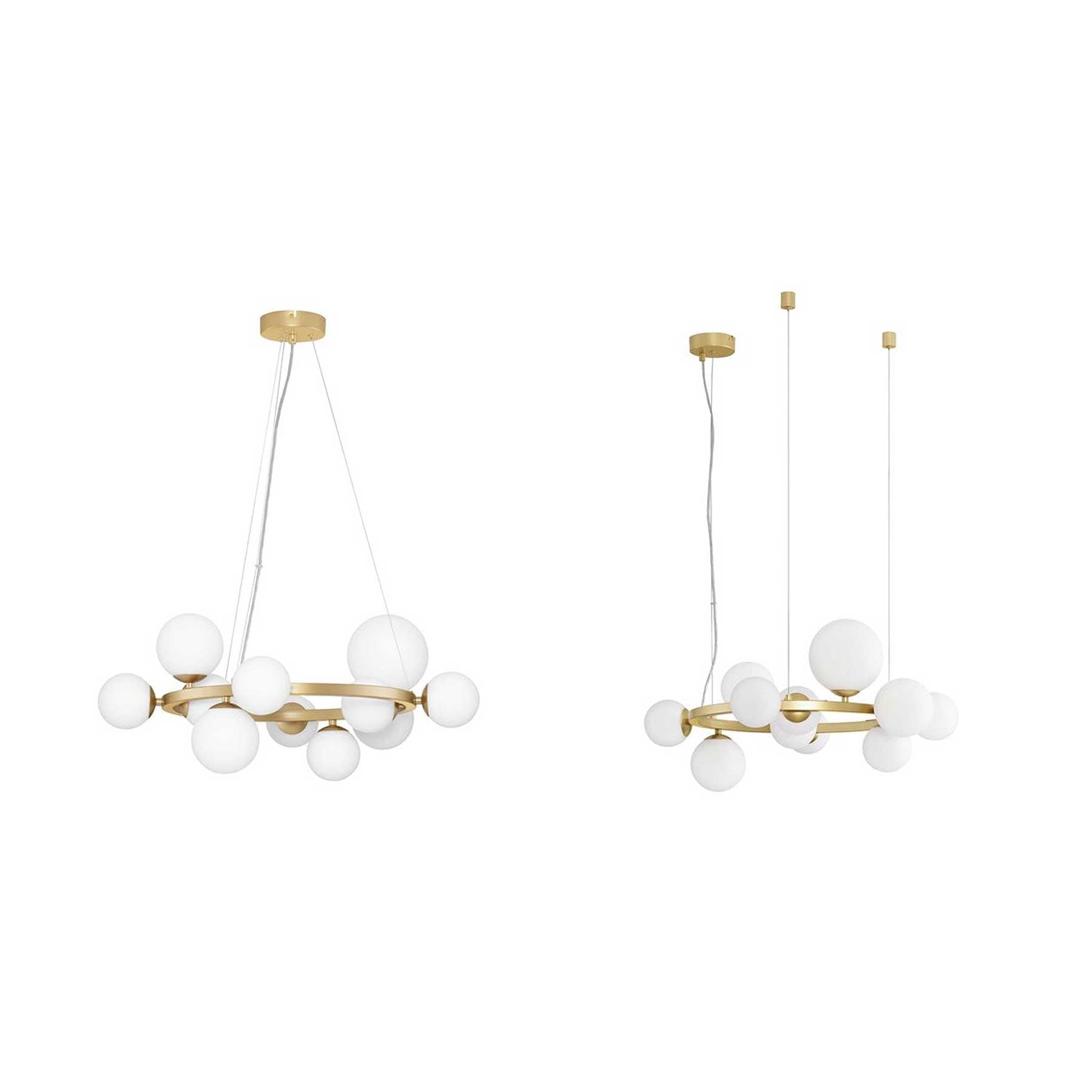 Ovisni stakleni luster iz kolekcije Odillia tvrtke Nova Luce moderan je i elegantan luster s kružnim okvirom i staklenim kuglama u stilu mjehurića koje interijeru daju razigrani, a opet profinjen izgled. Svjetiljka ima 11 G9 grla za LED žarulje, osiguravajući dovoljno osvjetljenja čak i u većim prostorima, i dostupna je u tri varijante stakla – prozirnom, dimljenom i opalnom. Prozirne i opalne staklene verzije također nude univerzalni sustav za vješanje s jedne rozete ili pojedinačno, što omogućuje fleksibilno podešavanje visine i načina ugradnje. Zahvaljujući svom čistom i bezvremenskom dizajnu, luster Odillia pogodan je za moderne dnevne boravke, blagovaonice, hotelske predvorje i urede, gdje služi ne samo kao izvor svjetla, već i kao upečatljiv dizajnerski element.